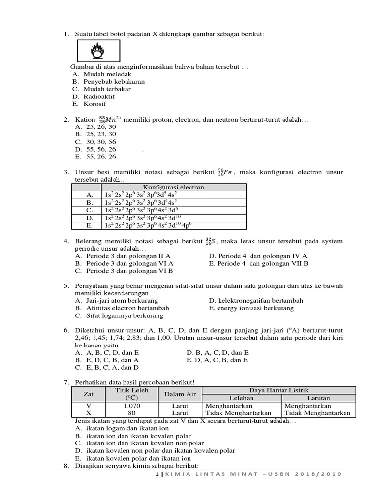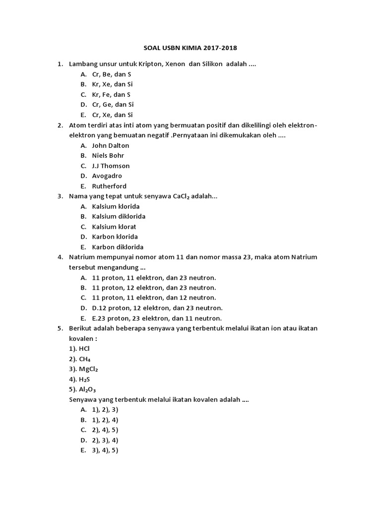Soal un kimia sma tahun 2018. Pelaksanaan ujian sekolah berstandar nasional sudah semakin dekat untuk itu soal usbn kimia ini mungkin bisa membantu anda untuk dijadikan bahan latihan atau uji coba kepada siswa. Soal dan kunci jawaban us/usbn smk mapel kimia tahun 2018. Lelehannya dapat menghantarkan listrik, ikatan ionik b. Sebagai bahan latihan/ pembekalan, soal usbn kimia ini mungkin akan bermanfaat untuk menambah persiapan siswa agar semakin siap dalam pelaksanaan ujian nanti.